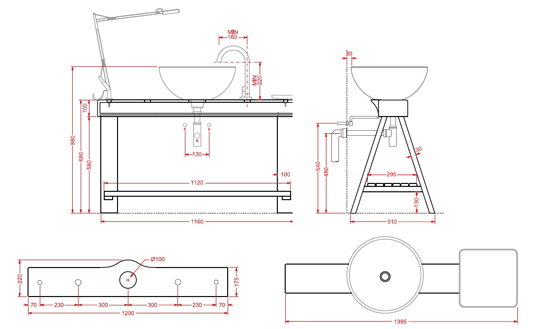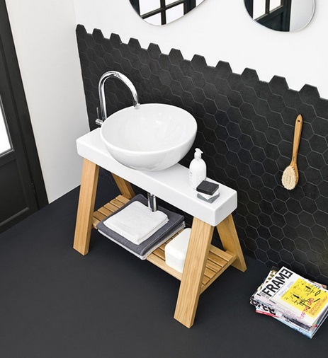 Zestaw składający się z ceramicznej umywalki, stelaża z ceramiczną podstawą i drewnianymi nogami oraz syfonu.