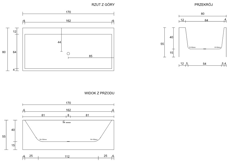 Wymiary:Długość: 170 cmSzerokość: 80 cmWysokość: 55 cmUWAGA: Ze względu na właściwości materiału, rzeczywiste wymiary produktu mogą odbiegać o ± 1,5% od wymiarów wskazanych w specyfikacji technicznej producenta.Pasujące produkty:Syfon CRISTWANZP