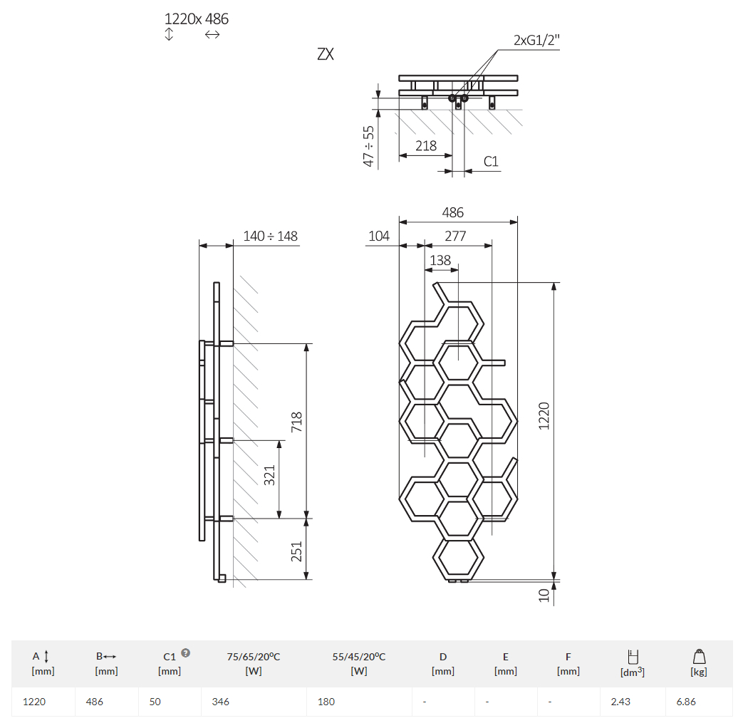 Terma Hex Grzejnik wodny ścienny 122x48,6 cm Copper WGH2X122048KCOPZX