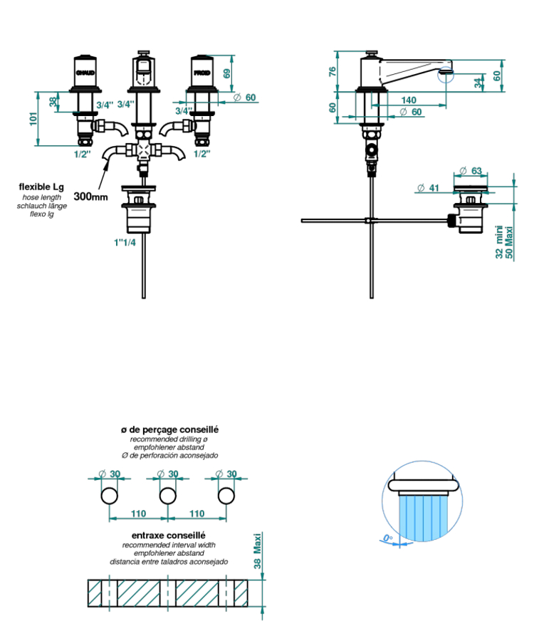 THG Faubourg Bateria umywalkowa 3-otworowa z korkiem automatycznym chrom G2K.A02.151