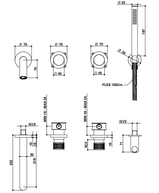 W komplecie z wylewką, mieszaczem, przełącznikiem, słuchawką, wężem i elementem potynkowym.
