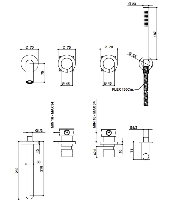 W komplecie z wylewką, mieszaczem, przełącznikiem, słuchawką, wężem i elementem potynkowym.
