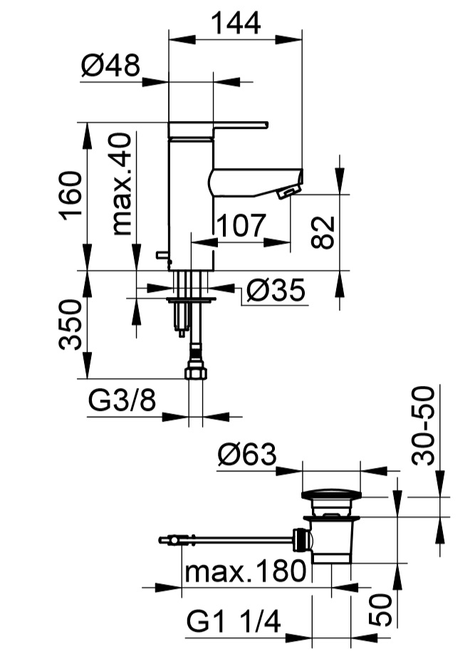 Z korkiem i systemem odpływowym 1 1/4 cala