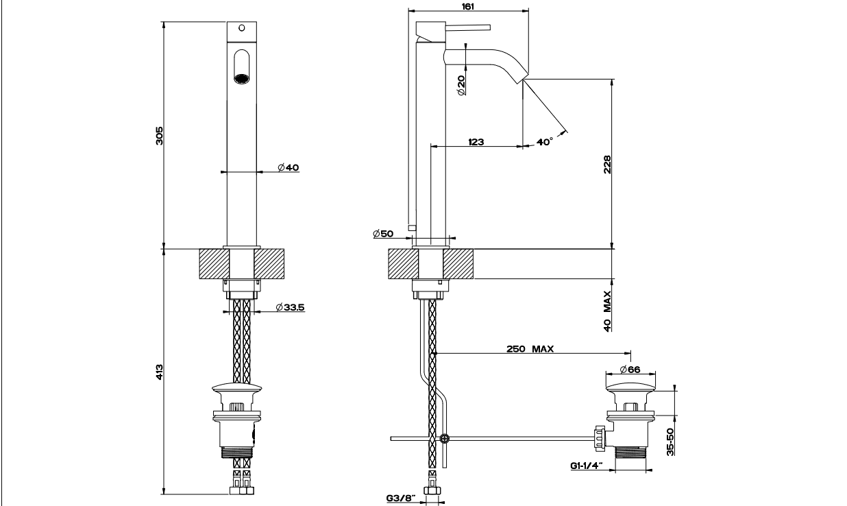 Gessi 316 Flessa Bateria umywalkowa jednouchwytowa z korkiem Steel Brushed 54004.239 / 54004239