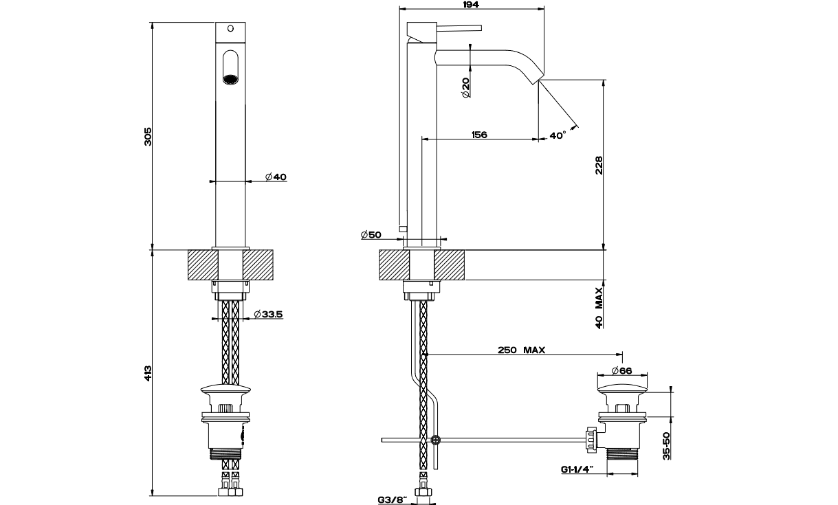 Gessi 316 Flessa Bateria umywalkowa jednouchwytowa z korkiem Steel Brushed 54003.239 / 54003239