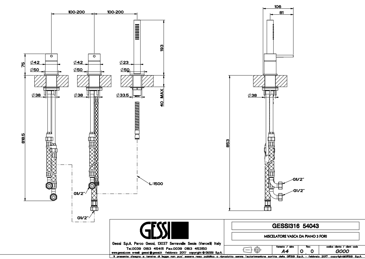 Gessi 316 Bateria wannowa trzyotworowa Steel Brushed 54043.239 / 54043239