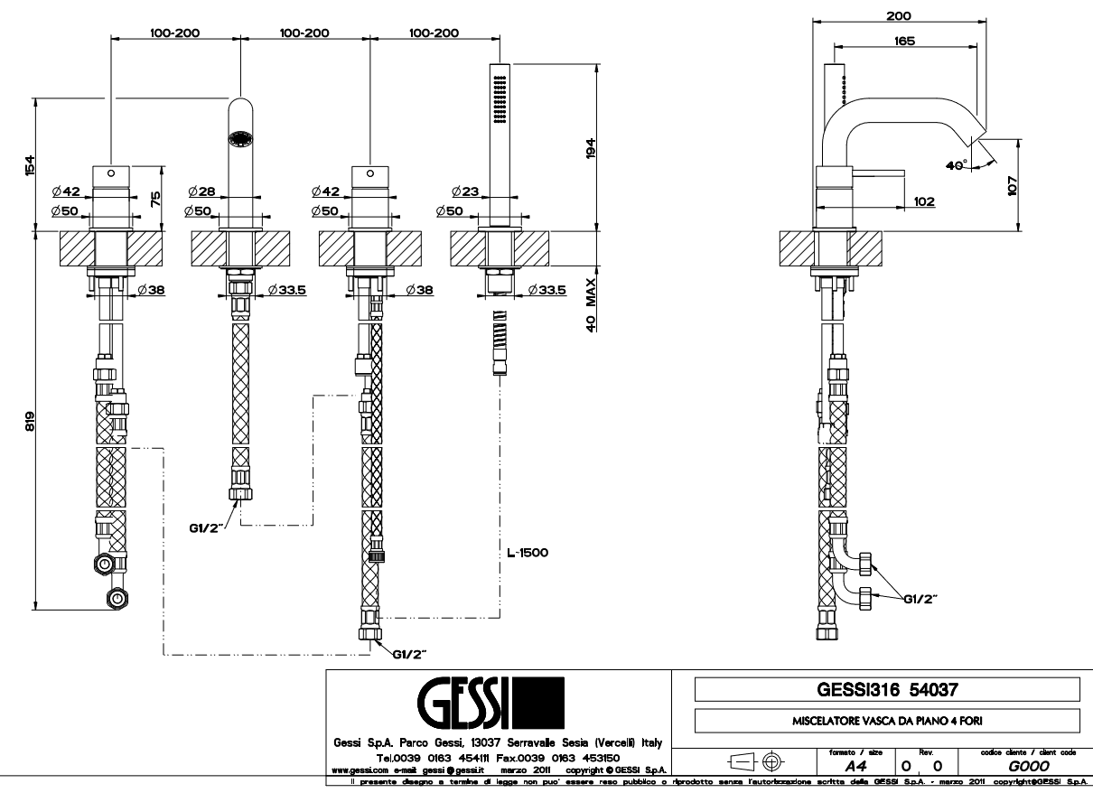 Gessi 316 Bateria wannowa czterootworowa Steel Brushed 54037.239 / 54037239