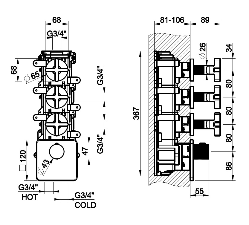 Rozstaw przyłączy: 80 mm