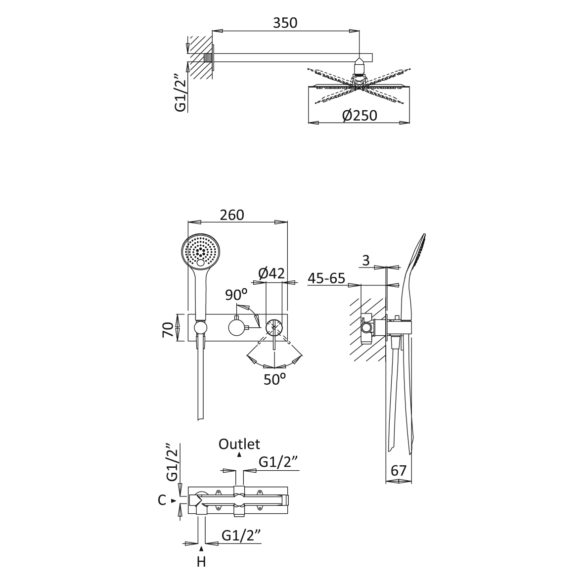 Zestaw natryskowy z deszczownicą, ramieniem, baterią podtynkową i słuchawką 3-funkcyjną.