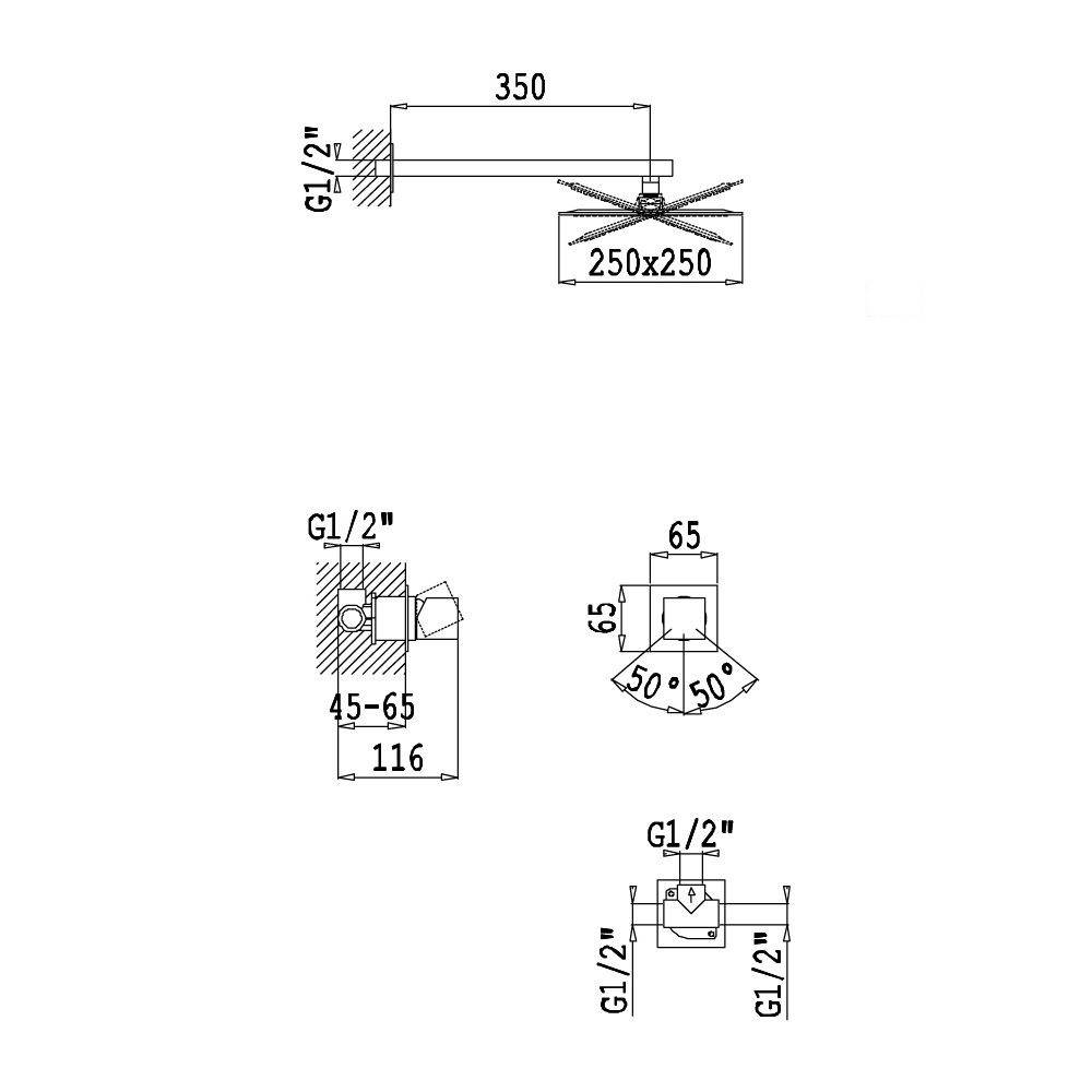 Zestaw natryskowy z deszczownicą, ramieniem, baterią podtynkową.