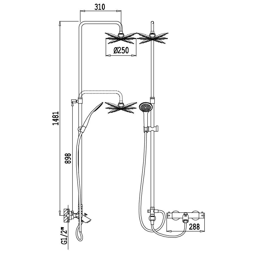Zestaw natryskowy z deszczownicą, regulowanym ramieniem, baterią termostatyczną i słuchawką.