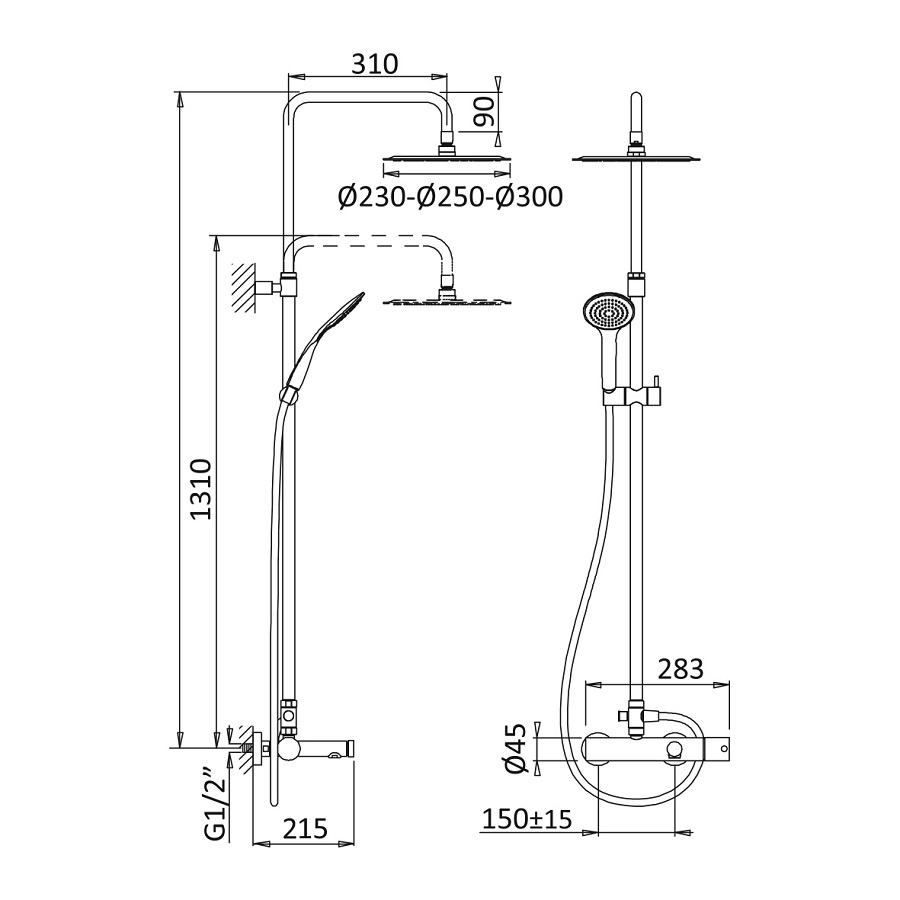 Zestaw składa się z baterii wannowej, węża, słuchawki, ultracienkiej deszczownicy ze stali nierdzewnej i ramienia ściennego.