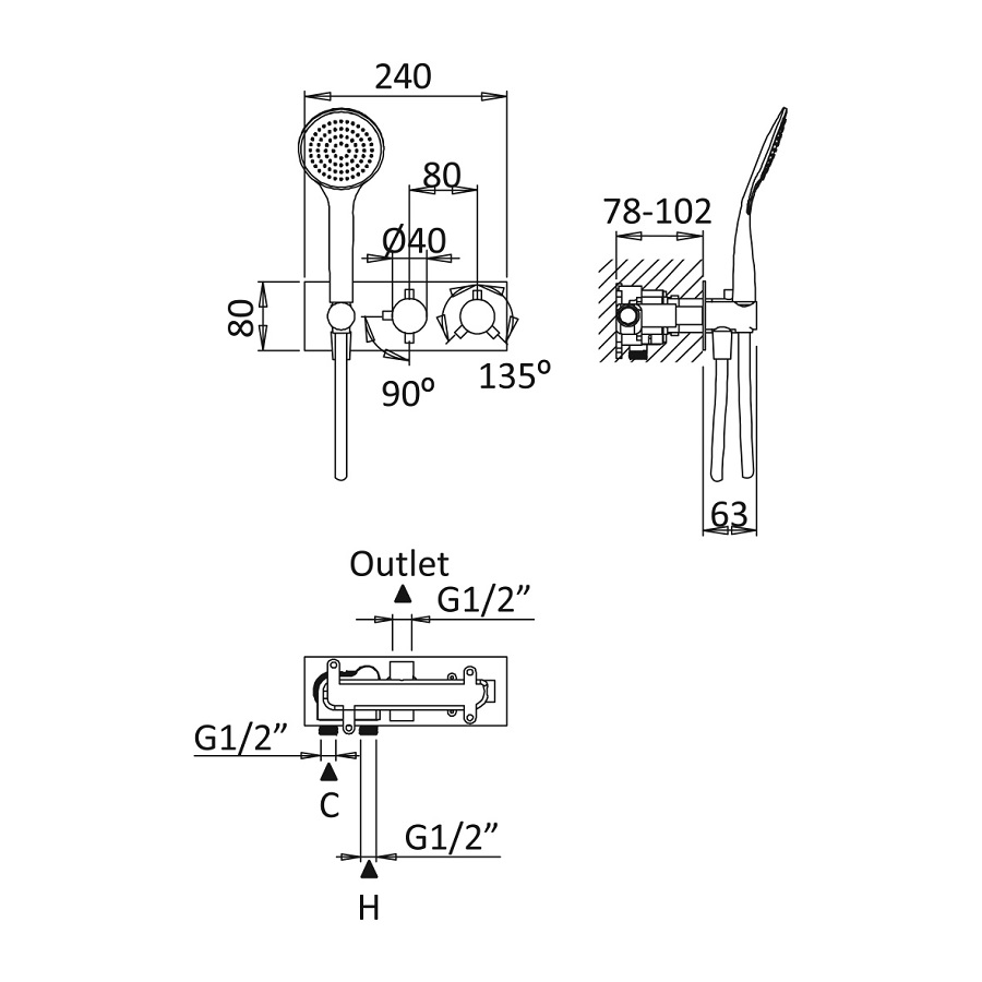Bateria podtynkowa 2-drożna ze słuchawką, wężem i elementem montażowym podtynkowym w komplecie