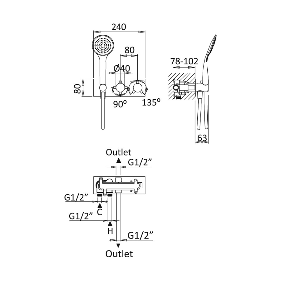 Bateria podtynkowa 3-drożna ze słuchawką, wężem i elementem montażowym podtynkowym w komplecie