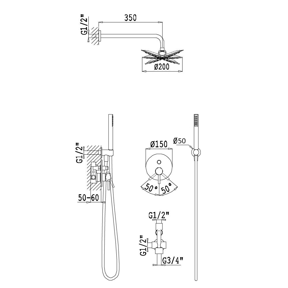 Bruma Lusitano Zestaw natryskowy 250 mm Podtynkowy z ramieniem ściennym i słuchawką night sky 1077608NS