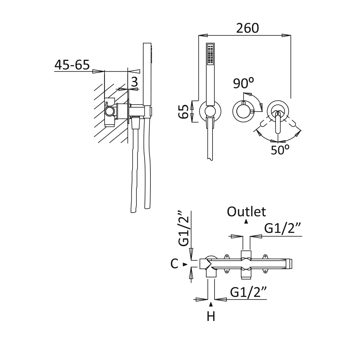 Bateria 3-otworowa ze słuchawką, mieszaczem i przełącznikiem.
