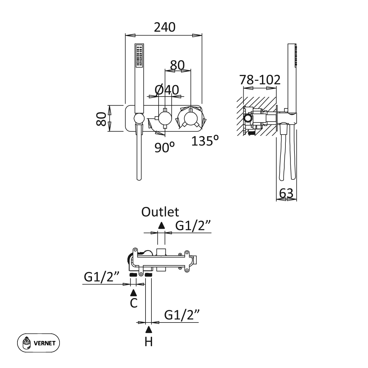 Bateria termostatyczna 3-otworowa ze słuchawką, mieszaczem i przełącznikiem.