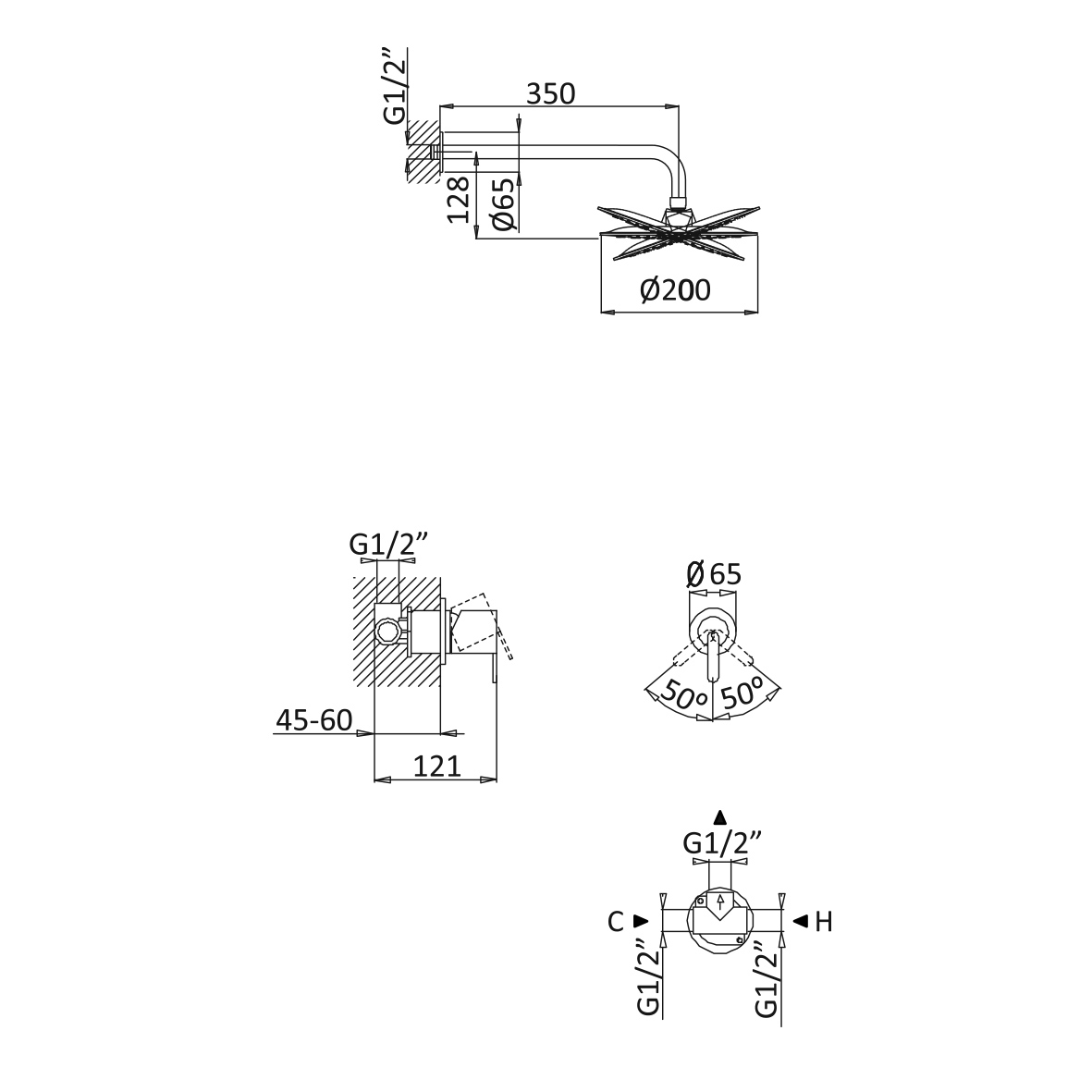 Zestaw zawiera mieszacz oraz deszczownicę na ramieniu ściennym