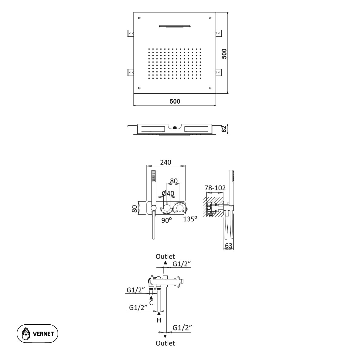 Bruma X-Alpha Zestaw natryskowy termostatyczny podtynkowy z deszczownicą 500x500 mm satin stainless steel 1863814IS