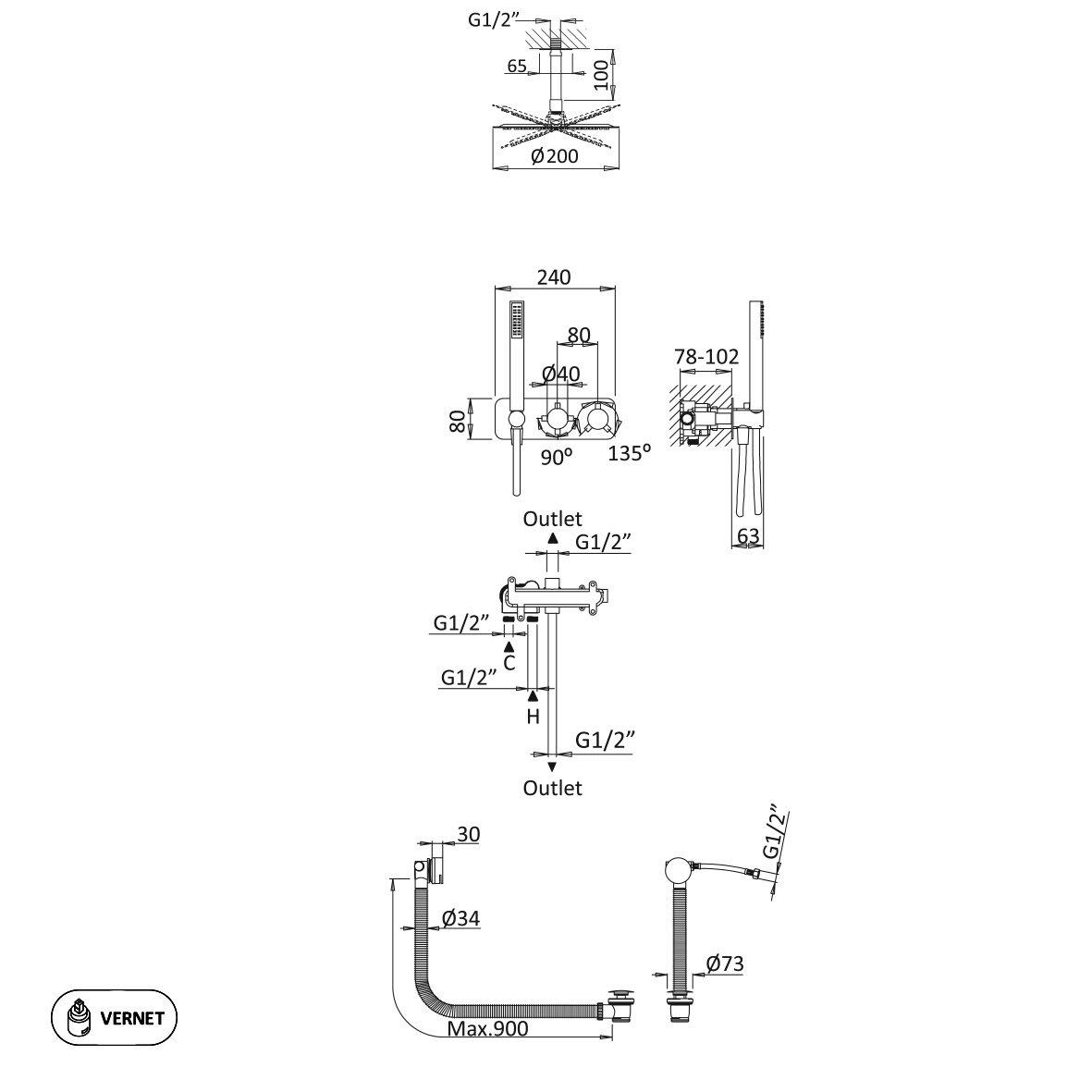 Zestaw zawiera baterię termostatyczną, mieszacz, słuchawkę, wąż oraz deszczownicę na ramieniu sufitowym