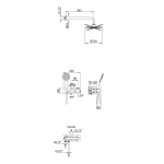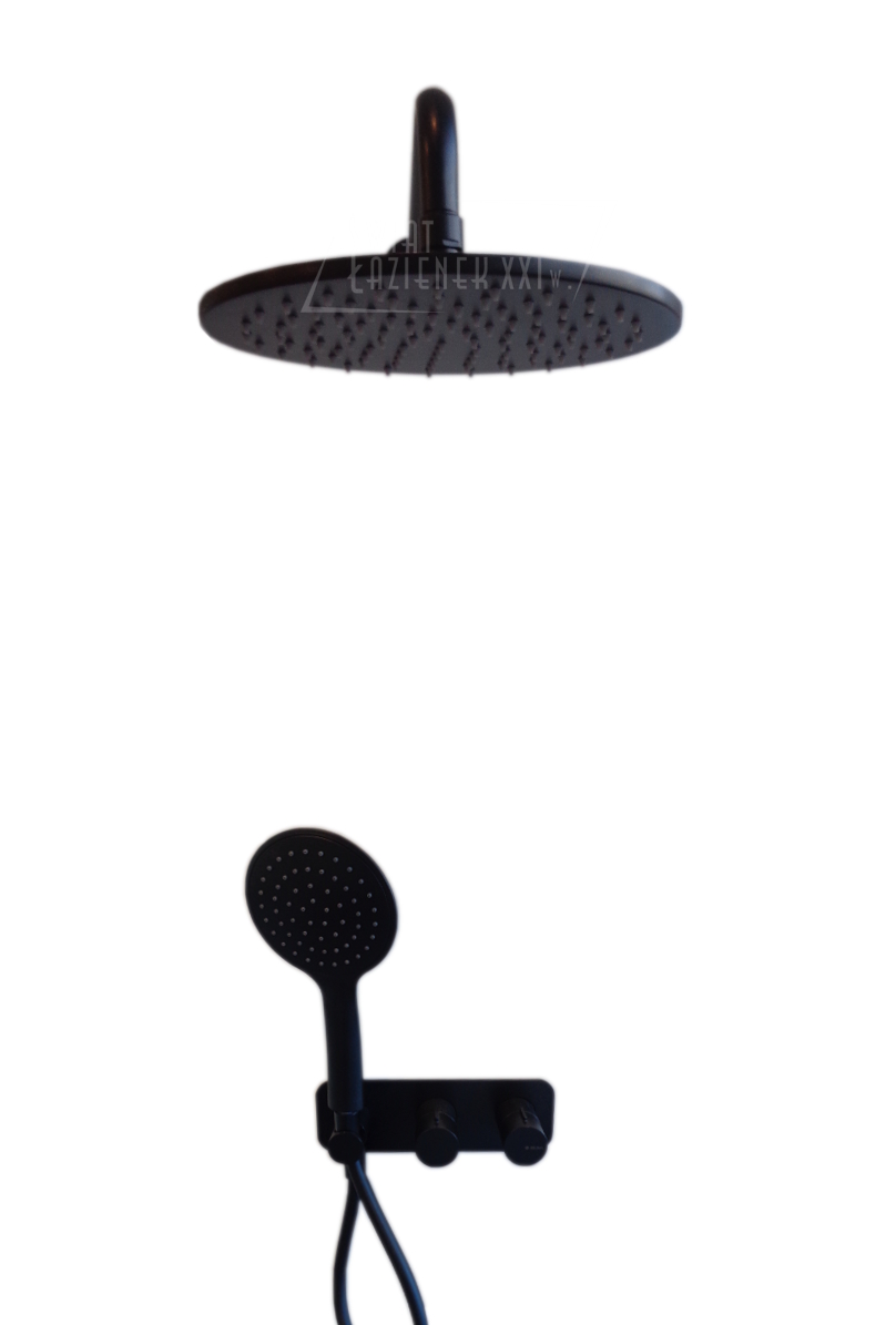 Zestaw zawiera baterię termostatyczną, mieszacz, słuchawkę, wąż oraz deszczownicę na ramieniu ściennym