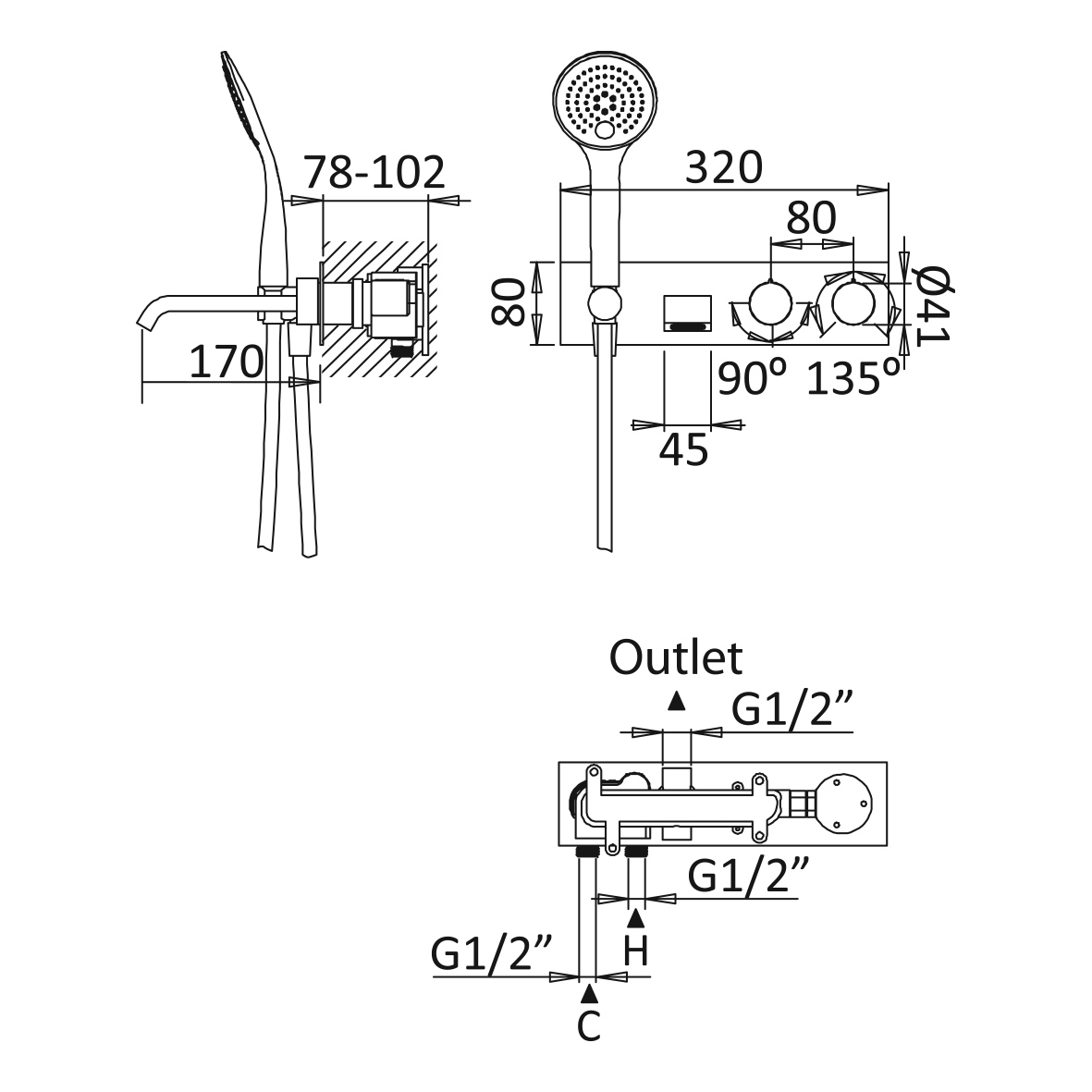 Bateria 3-drożna termostatyczna podtynkowa z elementem podtynkowym oraz słuchawką 3-strumieniową w zestawie.