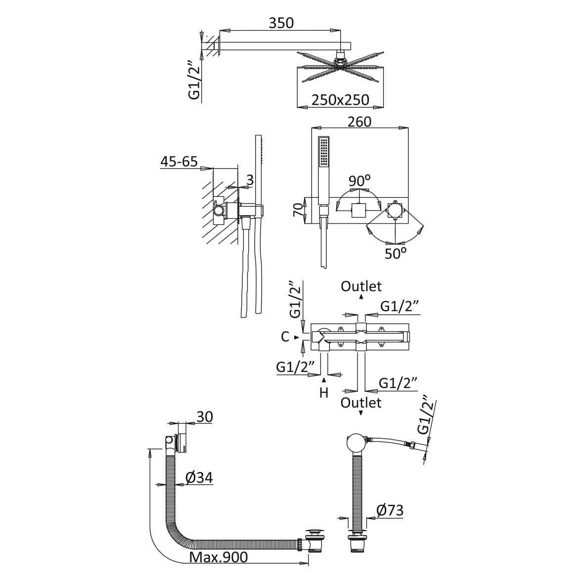 Bruma Adamastor Zestaw natryskowy 250 mm podtynkowy z ramieniem ściennym i syfonem chrom 3015712CR