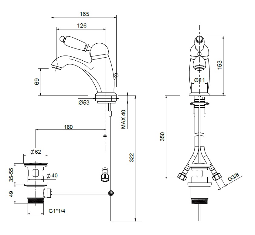 wysięg wylewki: 126 mm