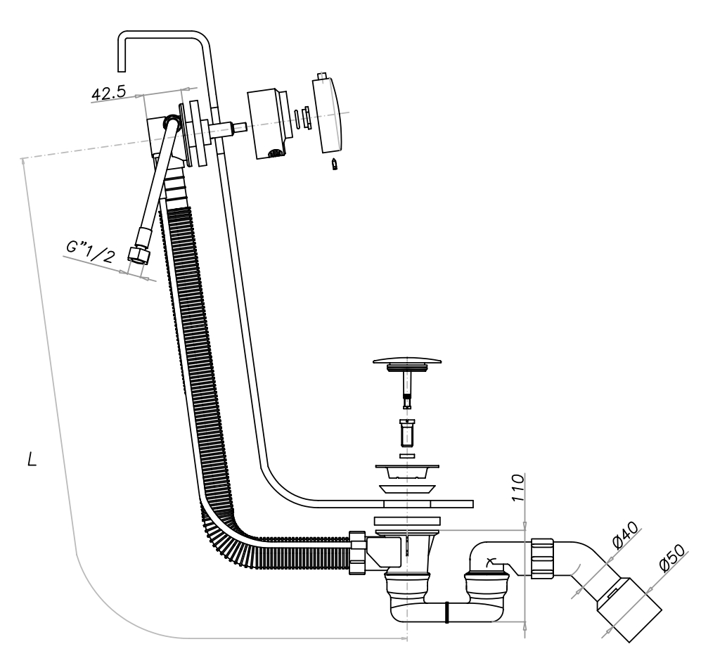 Korek automatyczny w komplecieWykończenie: Czarny matWysokość: 11 cmDługość: 81 cm (możliwość zastosowania do wanny o większej niż standardowo odległości pomiędzy otworem przelewowo-napełniającym a otworem odpływowym)Odpływ: ø52 mm