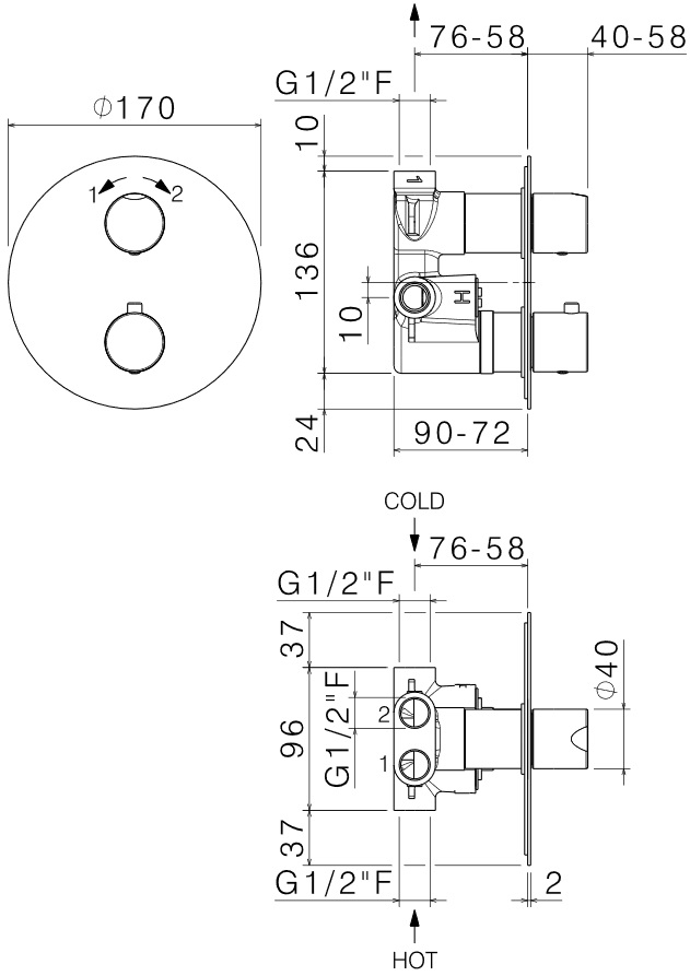 Bateria termostatyczna podtynkowa - 2 wyjścia, ABS