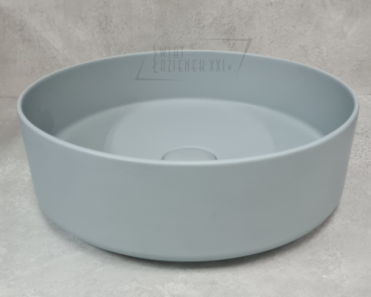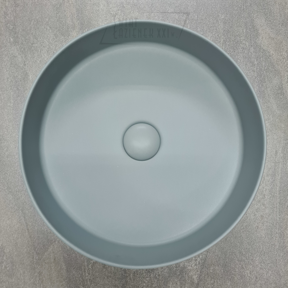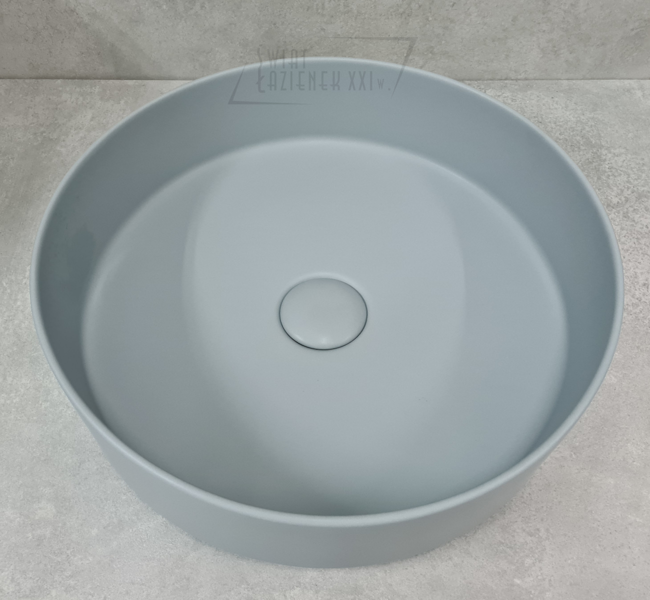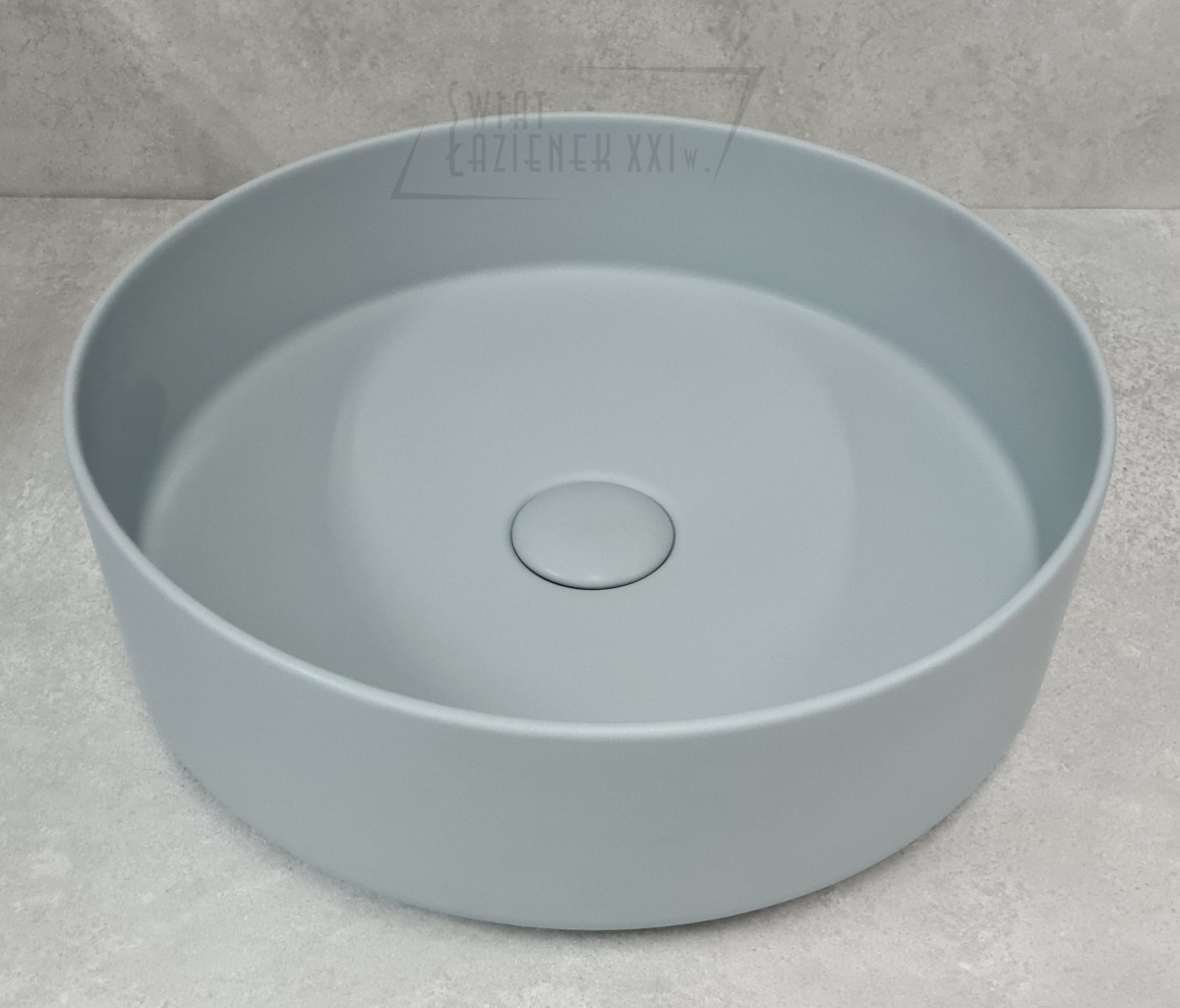 Umywalka okrągła stawiana na blat z korkiem w kolorze umywalki.