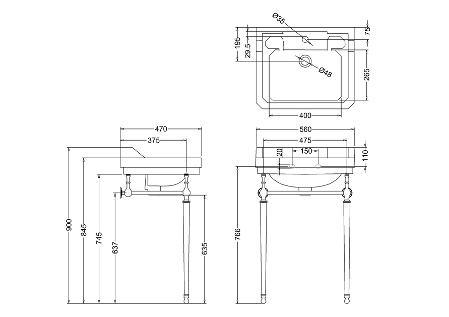 Burlington Jet Edwardian Umywalka ścienna 560 mm 2-otworowa, Czarny B4 2TH JET