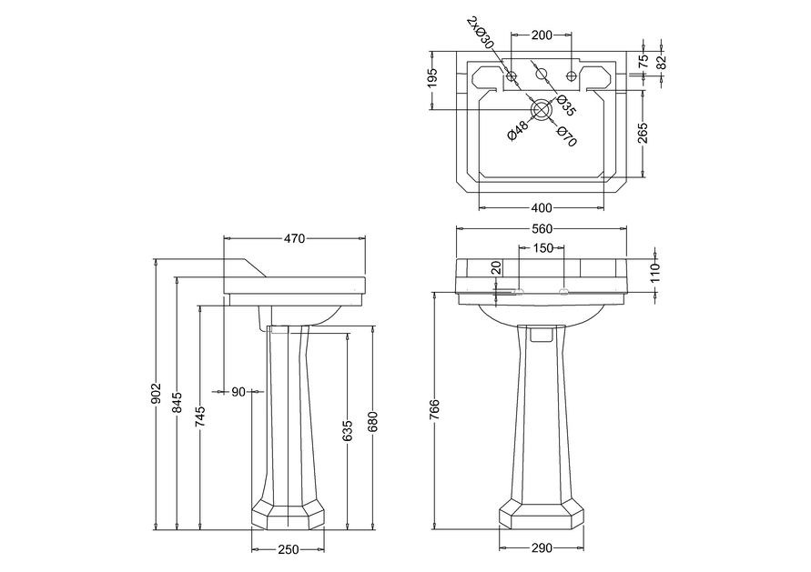 Burlington Bespoke Umywalka ścienna 56x47 cm 3-otworowa, Venice B43THVEN