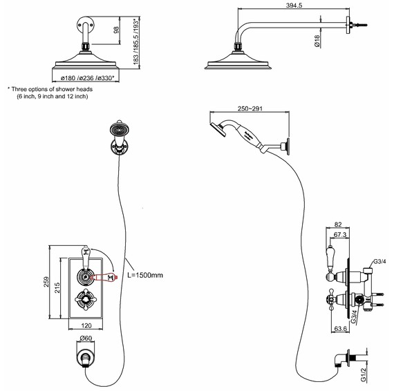 Wymiary: długość ramienia: 395 mm wysokość rozety: 215 mm szerokość rozety: 120 mm długość węża: 1500 mm