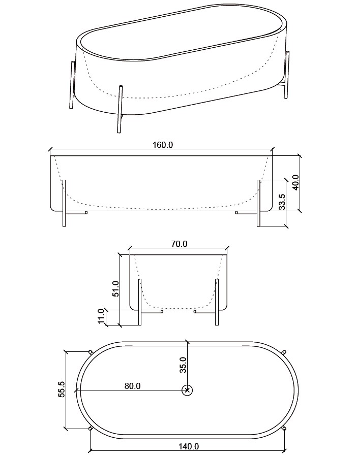 Ex.T Stand Wanna Wolnostojąca 160x70 cm na stelażu złotym EXTSTAND