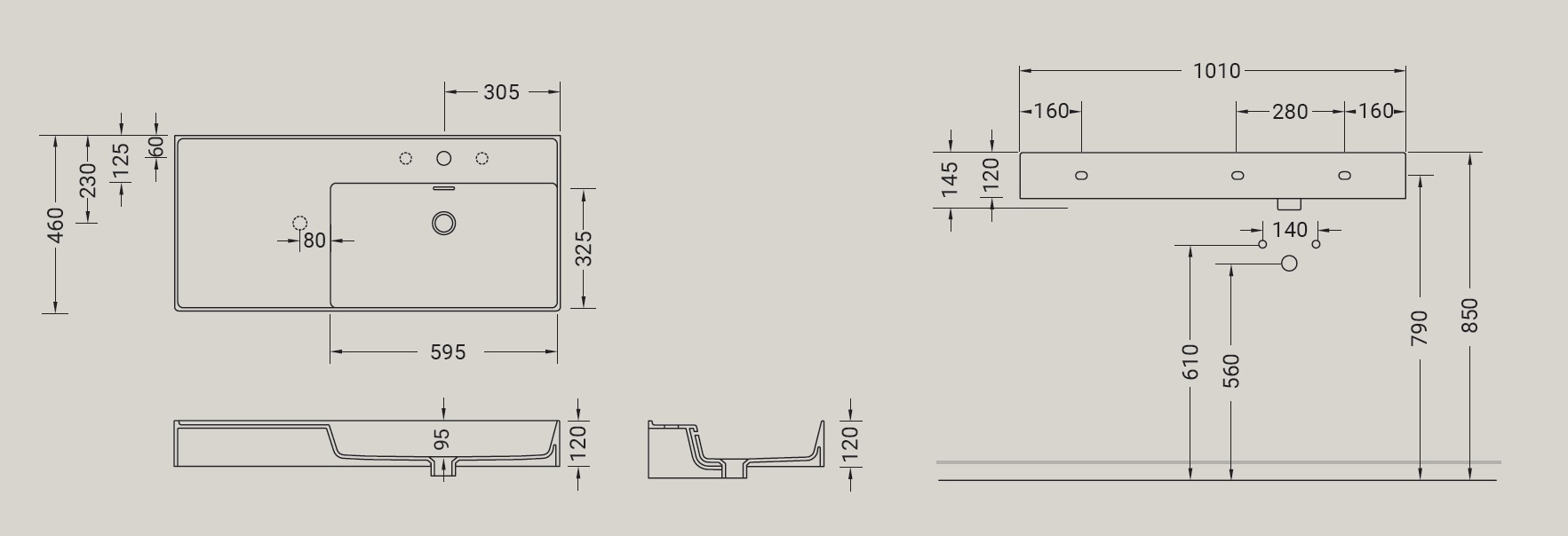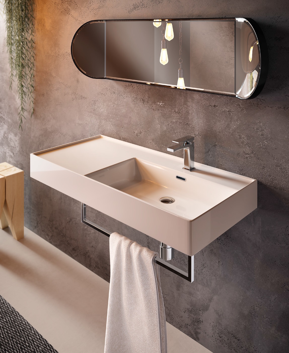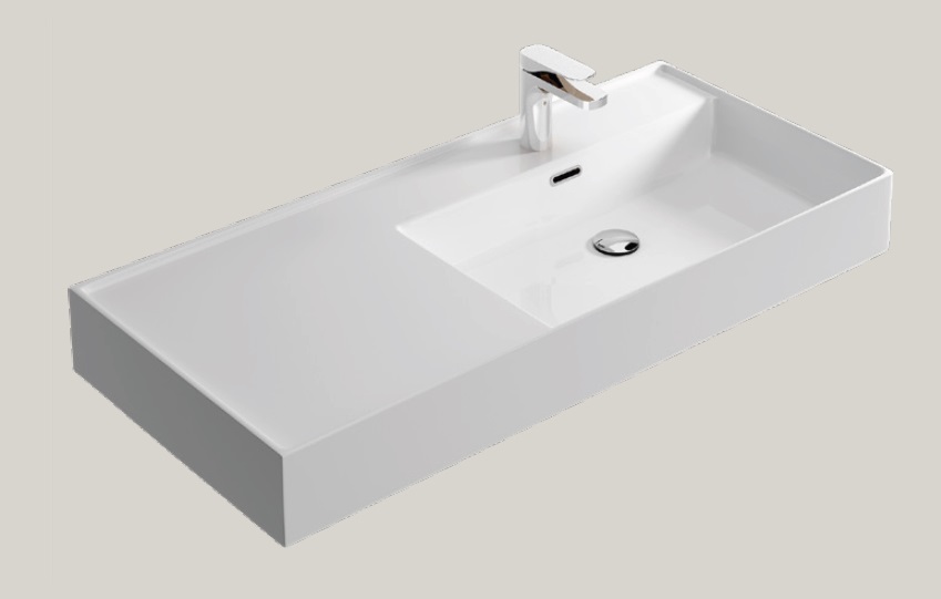 Hidra Faster Kiub Umywalka ścienna 101x46 cm z półką po lewej Biała KI100SX.001z jednym otworem pod baterię (z możliwością wycięcia trzech otworów)