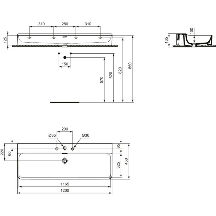 Ideal Standard Conca Umywalka ścienna 1200x450 mm z 3-otworami na baterię Biały T384001