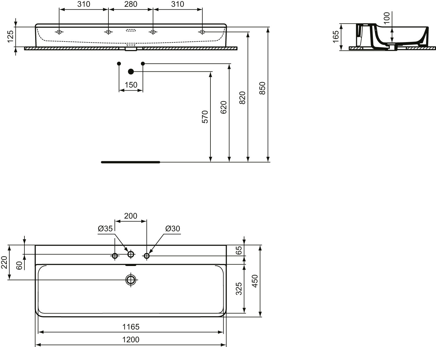 Ideal Standard Conca Umywalka ścienna 1200x450 mm z 3-otworami na baterię Biały T384301