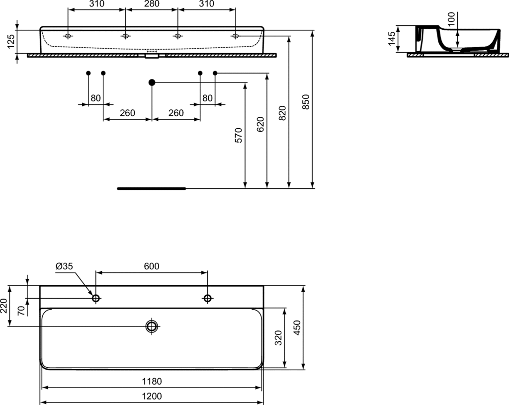 Ideal Standard Conca Umywalka ścienna 1200x450 mm z 2-otworami na baterię Biały T384401