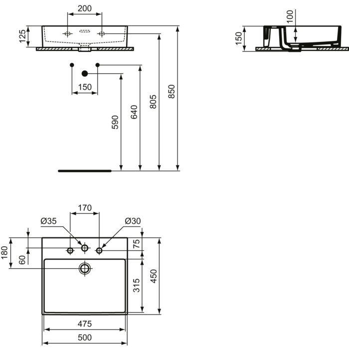 Ideal Standard Extra Umywalka ścienna 500x450 mm z 3-otworami na baterię Biały T388501