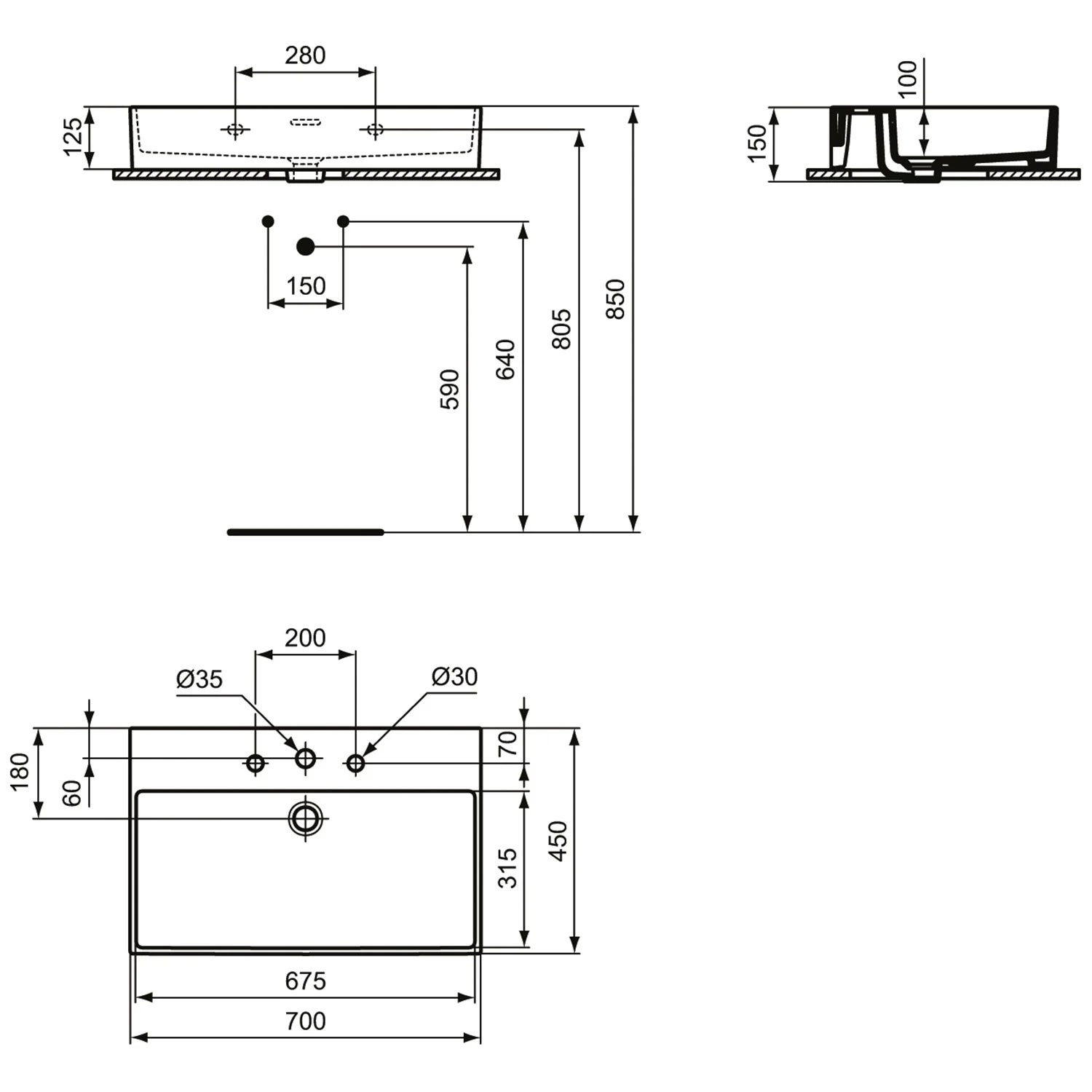 Ideal Standard Extra Umywalka ścienna 700x450 mm z 3-otworami na baterię Biały T389201