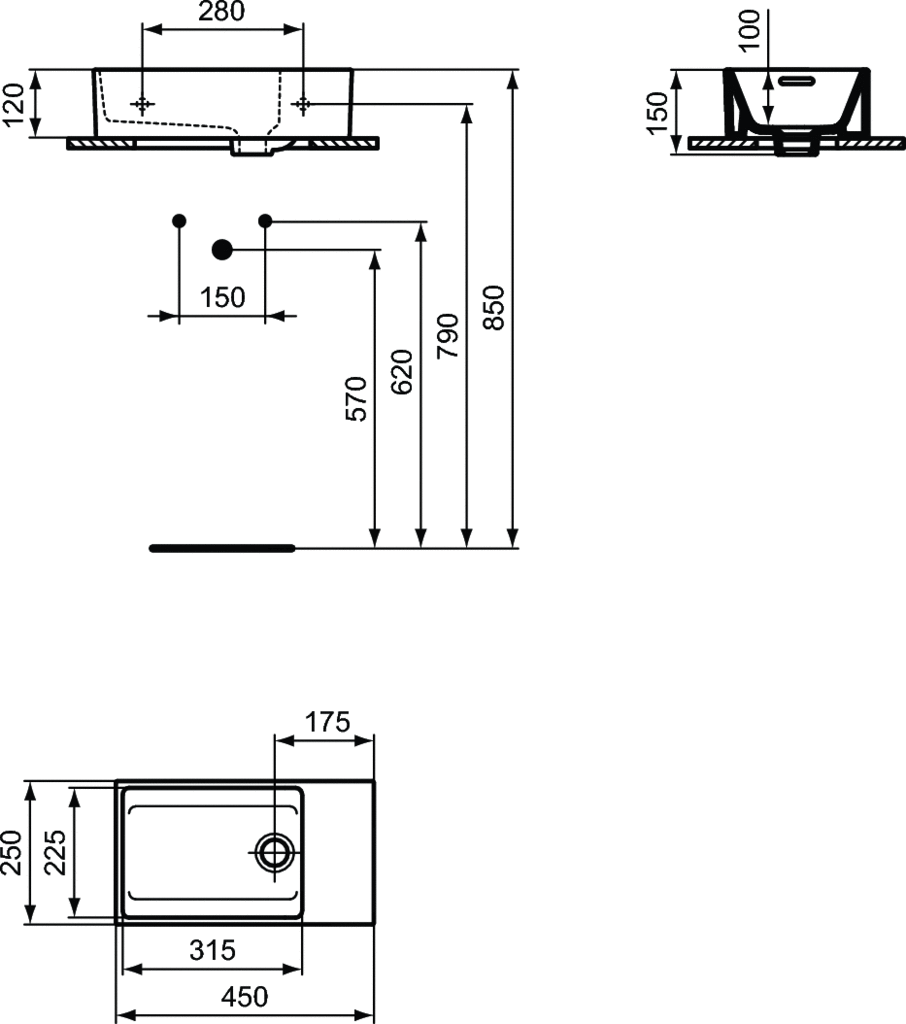 Ideal Standard Extra Umywalka ścienna 450x250 mm bez otworu na baterię, Prawa Biały T392201