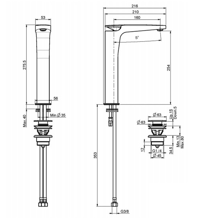 Wymiary: wysokość: 275,5 mm wysięg wylewki: 160 mm wysokość wylewki: 254 mm szerokość baterii: 53 mm