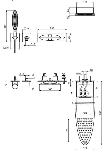 szerokość rozety mieszacza: 250 mm