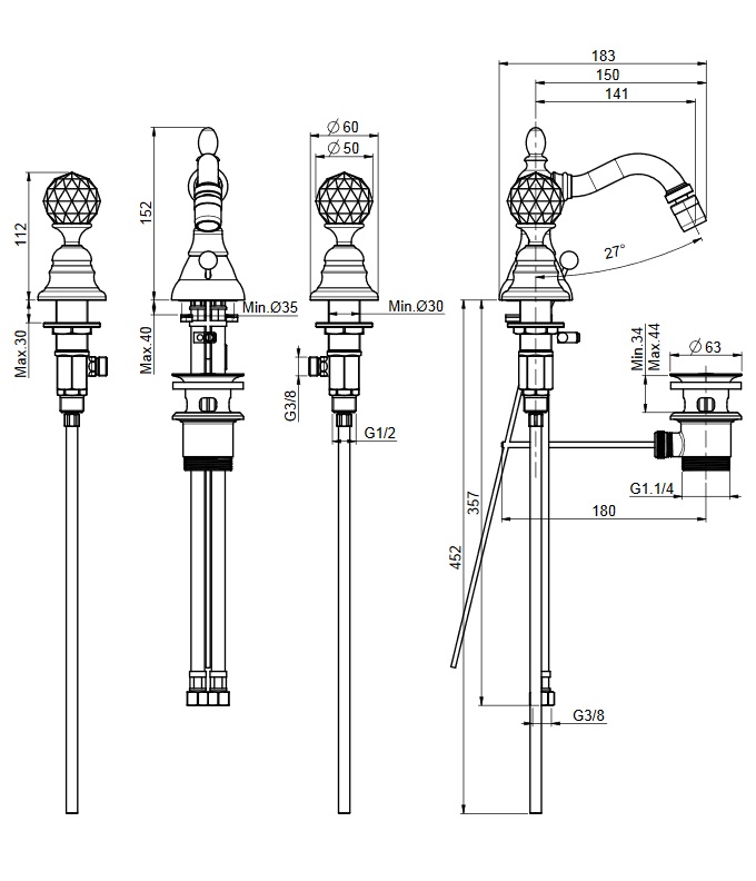 Carlo Frattini Elizabeth Chic Bateria bidetowa 3-otworowa z korkiem automatycznym Chrom F5082CCR