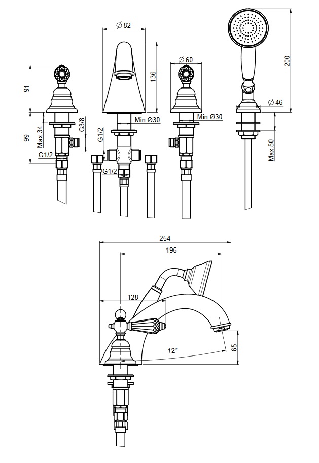 Carlo Frattini Herend Chic Bateria wannowa 4-otworowa ze słuchawką prysznicową Chrom F5414CBCR