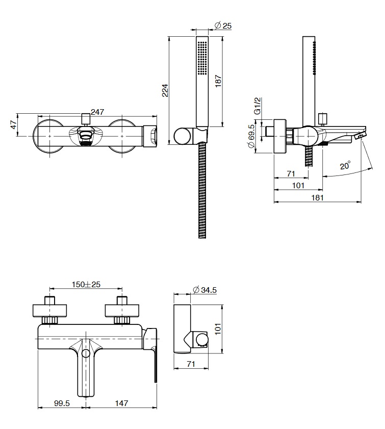 Carlo Frattini Mast Bateria wannowa z zestawem natryskowym Chrom F3134CR