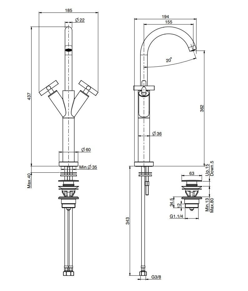 wysokość wylewki: 362 mm