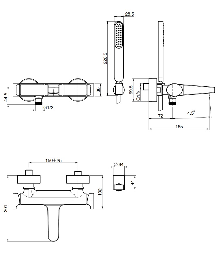 wysięg przyłącza natrysku: 72 mm