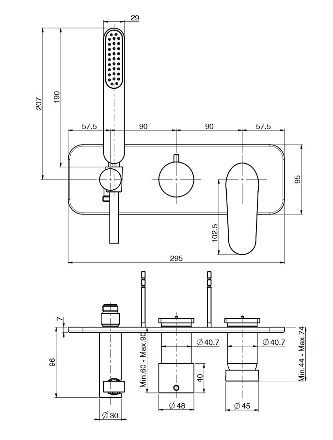 wysięg uchwytu: 44 - 74 mm